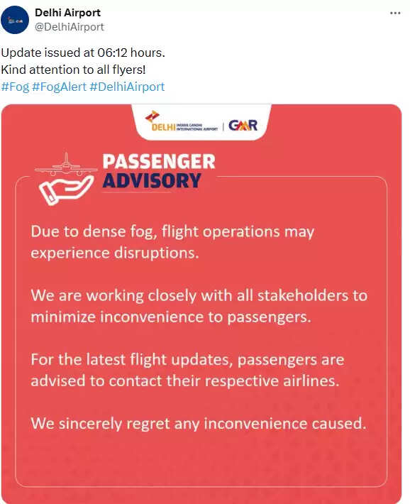 Delhi Airport ने सोशल मीडिया 'एक्स' पर एडवाइजरी जारी की है, जिसमें लिखा है कि "घने कोहरे के कारण उड़ान संचालन में रुकावट आ सकती है। यात्रियों को होने वाली असुविधा को कम करने के लिए हम सभी हितधारकों के साथ मिलकर काम कर रहे हैं। लेटेस्ट उड़ान अपडेट के लिए, यात्रियों को अपनी संबंधित Airline से संपर्क करने की सलाह दी जाती है। असुविधा के लिए हमें खेद है।"