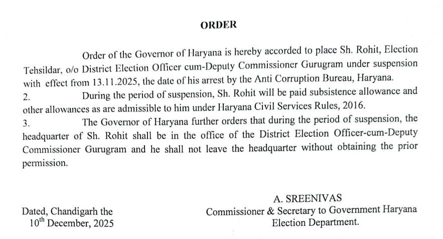 हरियाणा में चुनाव तहसीलदार सस्पेंड, दो लाख रुपये की रिश्वत लेते किया था गिरफ्तार