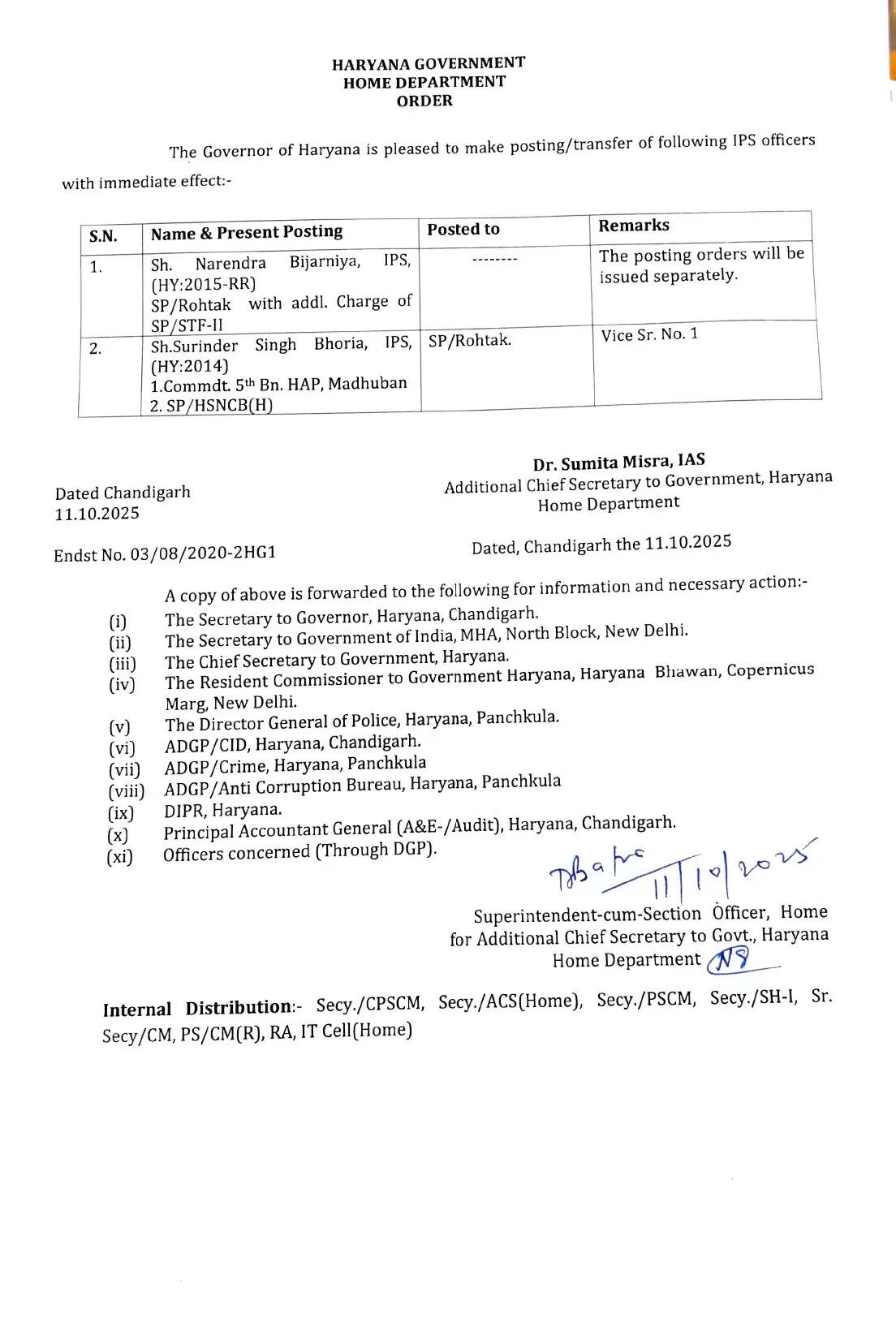 आपको बता दें कि वरिष्ठ आईपीएस अधिकारी वाई पूरन कुमार खुदकुशी केस में डीजीपी और एसपी नरेंद्र बिजारणियां का नाम प्रमुख तौर पर आया था जिसके बाद आज आईपीएस अधिकारी नरेंद्र बिजारणियां को रोहतक एसपी पद से हटा दिया गया है।